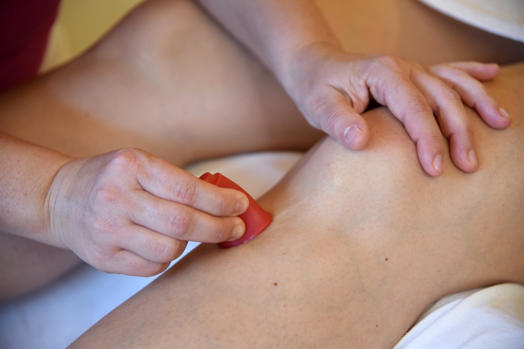 Hier wird ein Silikoncup verwendet. Der Cup wird auf die Haut bzw. Narbe aufgesetzt und Unterdruck erzeugt, mit dem man eine höhere Durchblutung im Gewebe erreicht. Durch das Bewegen des Cups, werden auf diesem Bereich die Gewebsschichten verschoben und man löst damit Verklebungen in den Faszien. Indem man vor dem aufsetzen des Cups zusätzlich noch eine Creme oder Salbe aufträgt, wird diese zugleich in die Haut eingearbeitet und verhilft zu Besseren Gleiten auf der Haut. - Akupressur Massage